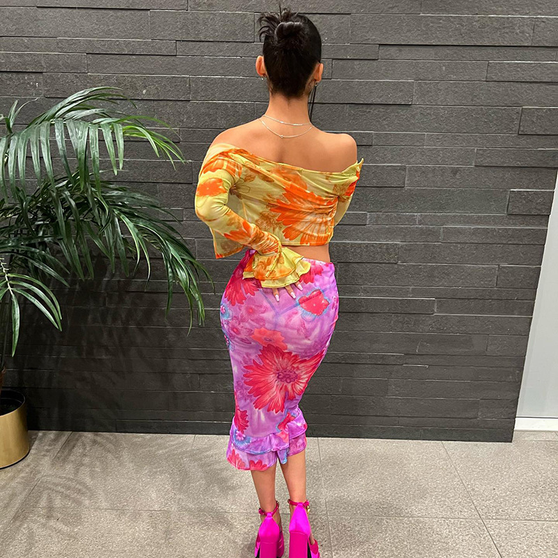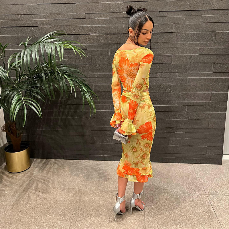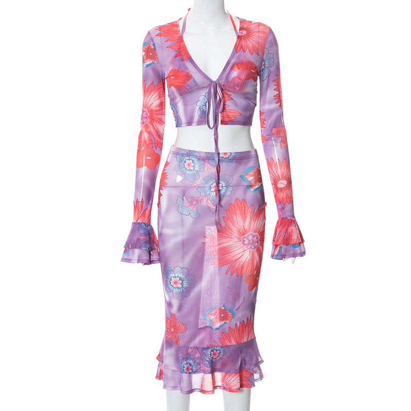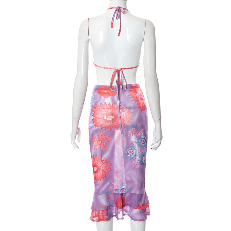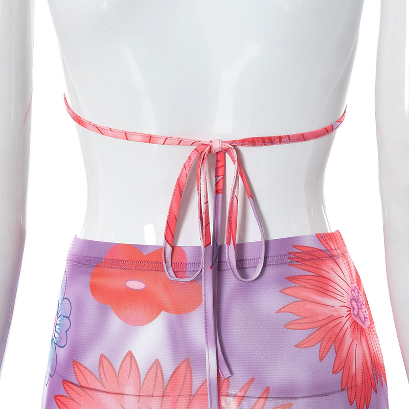 Womens Floral Print Midriff Baring Flared Sleeve Ruffle Trim Swimsuit Dress Set